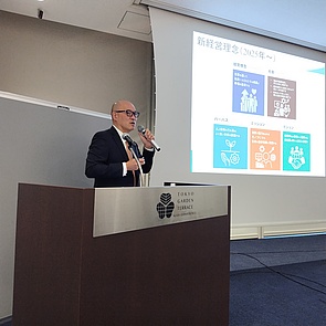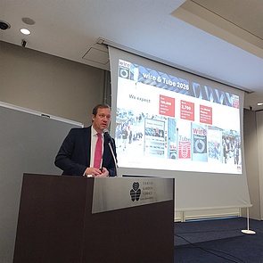 プレゼンテーションでは「wire/Tube」の業界における重要性や見どころ、今だからこそ知っていただきたい国際性の高いメッセ参加の意義などをメッセ・デュッセルドルフで本展のダイレクターを務めるダニエル・リフィッシュ(Daniel Ryfisch)がご案内しました。